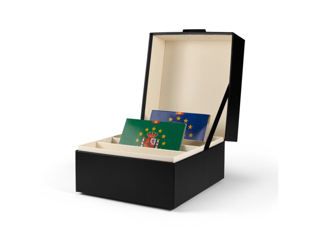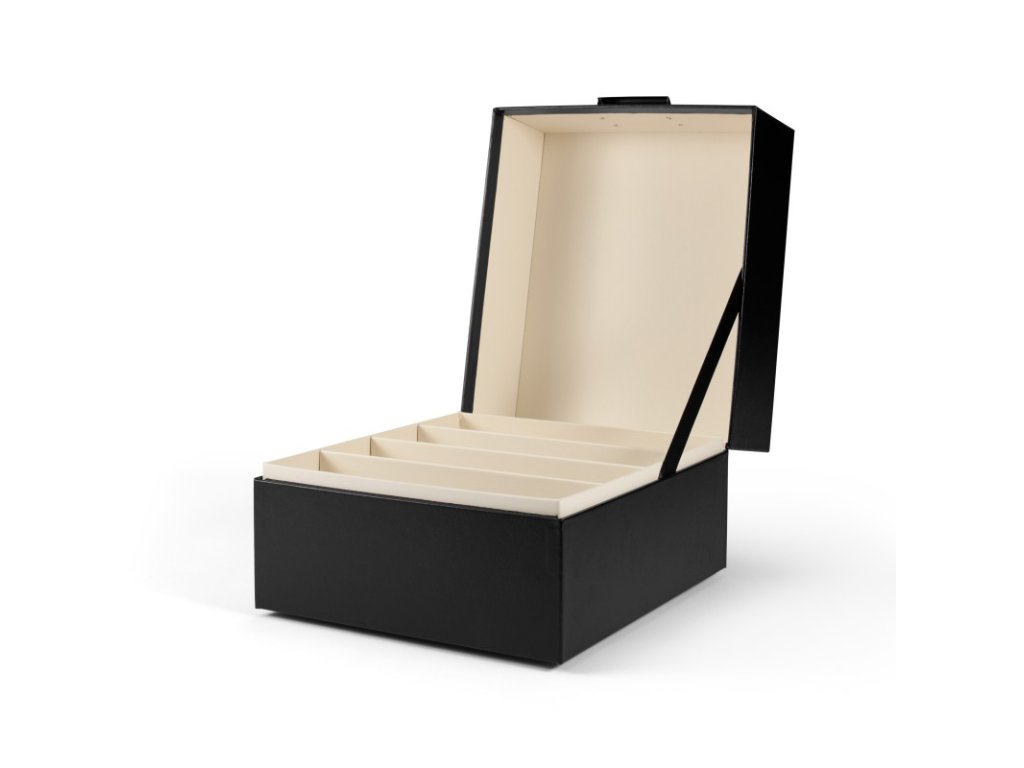 | Materiál: | Stabilní pevná kartonová krabička je potažena černou tapetou s texturou a povrchovou úpravou imitující kůži. |