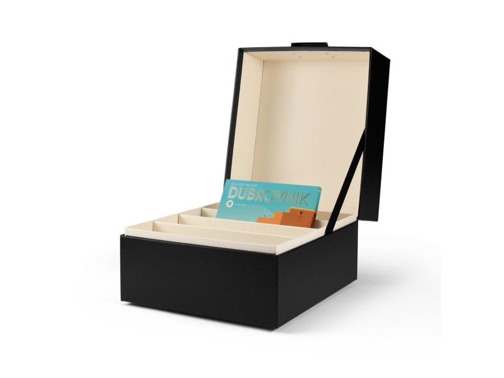Kvalitní velký černý box v elegantním designu s okénkem na popisek.