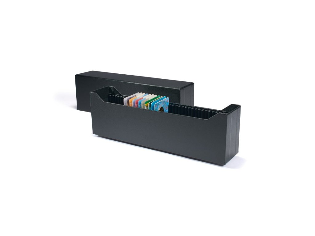S praktickým archivačním boxem LOGIK vertikalní získáte ideální systém pro ukládání svých coincardů (mincovní karty, coin card), kreditních karet nebo blistrů se zlatými slitky. Nadčasový a elegantní design v matné černé barvě a kvalitní zpracování navíc působí velmi atraktivně. Pevné vnitřní rozdělení umožňuje uložení až 40 coincardů nebo blistrů se zlatými slitky ve svislé poloze. Maximální rozměry vkládaného předmětu jsou 85 × 54 mm. Vnější rozměry boxu jsou 300 x 65 x 95 mm (30 x 6,5 x 9,5 cm).