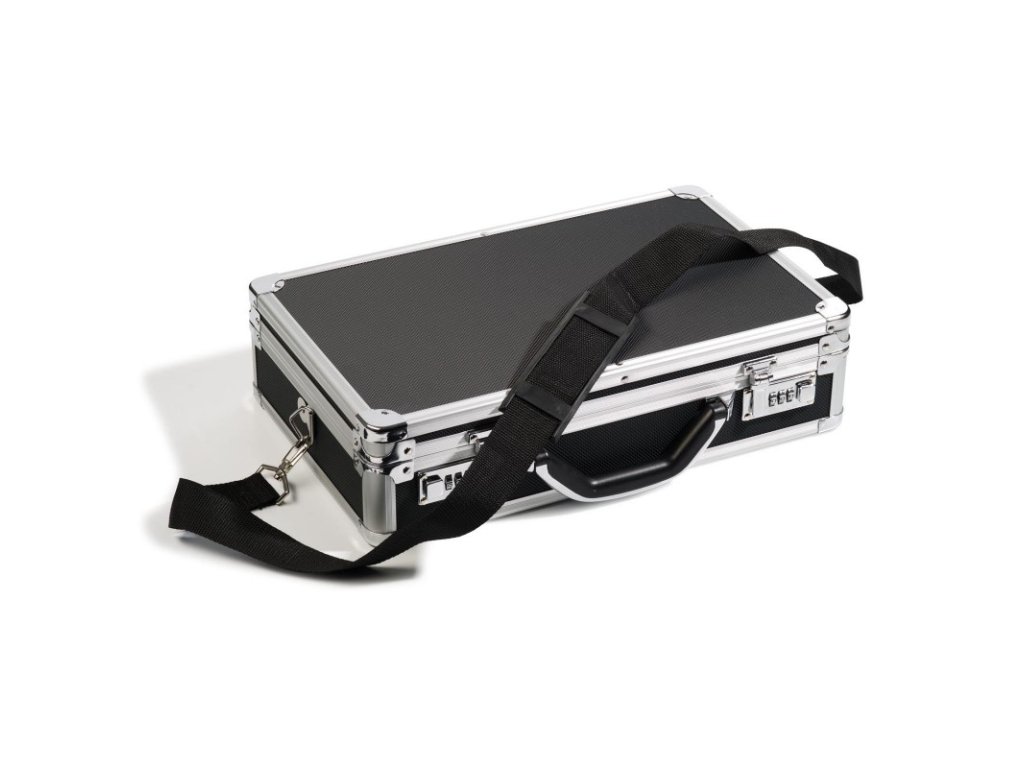 Praktický, snímatelný popruh umožňuje pohodlný a bezpečný transport. Solidní vnitřní konstrukce je zárukou toho, že plata a mince setrvají i při svislém transportu bezpečně na svém místě. Kufr je uvnitř vystlán kompletně černým velurem, kryt kufru je polstrován. Pro uživatele praktická úchytka k vyjímání tabel. Praktická a pěkně tvarovaná rukojeť. Barva kufru: černá / stříbrná. Vnější rozměry: 409 x 102 x 255 mm. Mincovní kufřík bez plat, vhodný až pro 6 plat formátu L